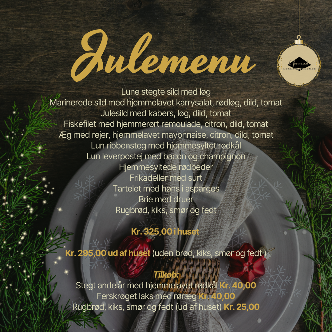 Vi holder fast i de klassiske opskrifter, som hører julen til. Vi kan lave menuen alt fra den intime julemiddag til den store julefrokost. Se menuen herunder.