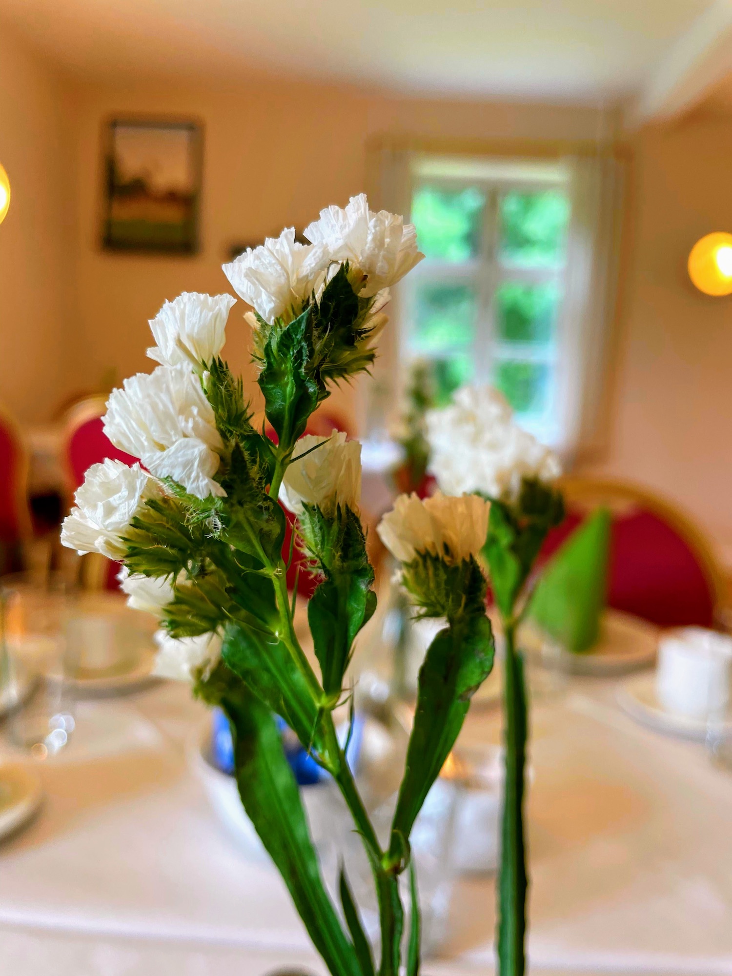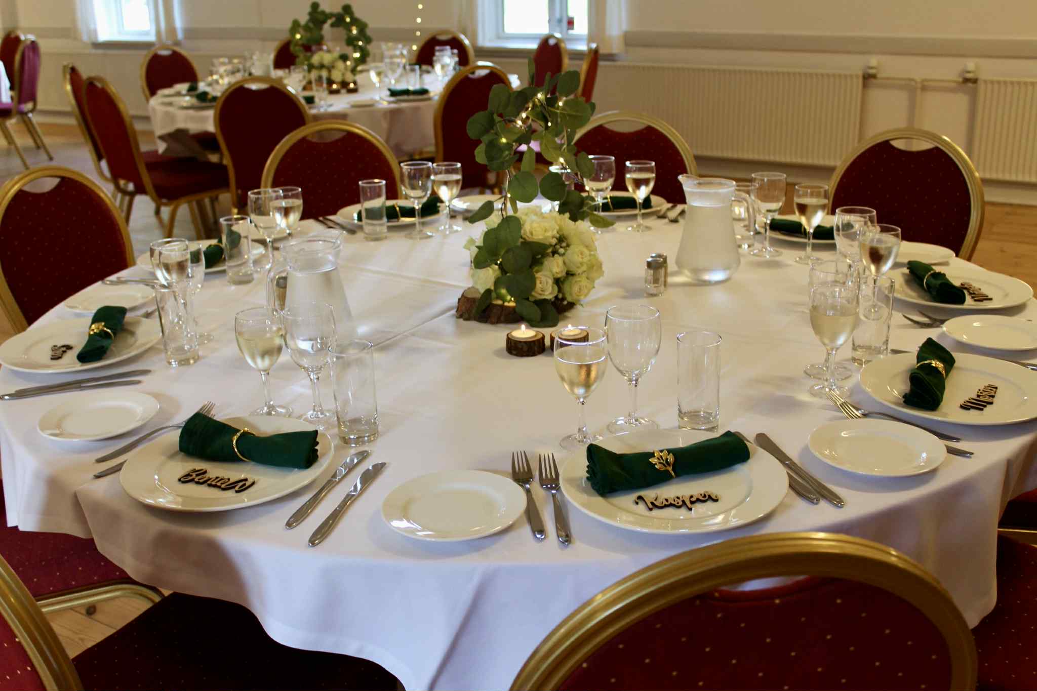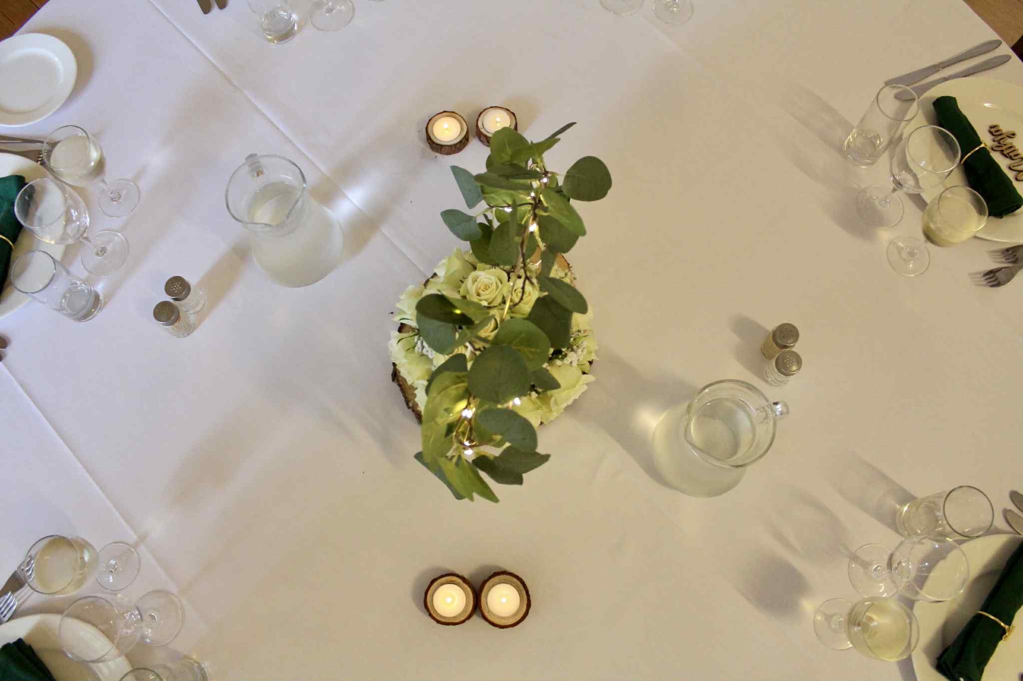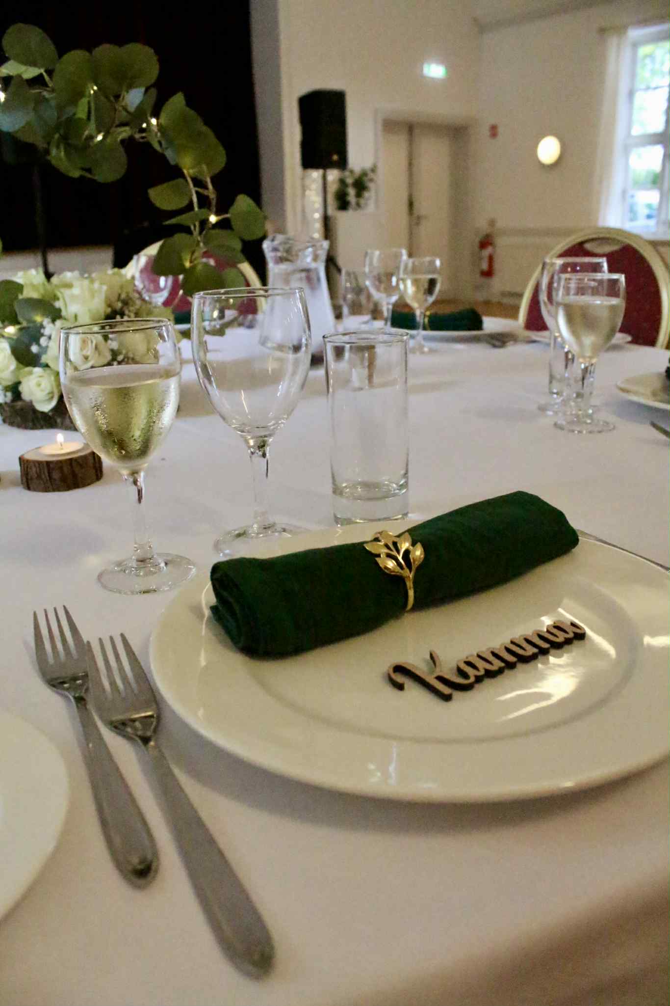 Opdækning med hvide duge og servietter: